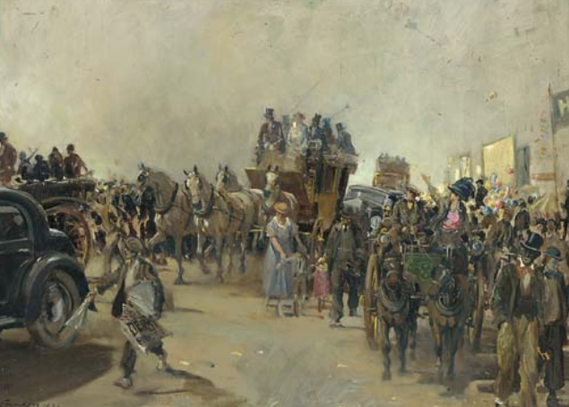 Young and amorous, Seago looked for novel experiences to use as inspiration for his paintings. When he was nineteen, he traveled with a circus, taking in the fresh air, unrestricted lifestyle, and vibrant inspiration of the performers in their caravans and tents. It's evident that the thrill of Derby Day gave him the same kind of inspiration, with the audience and horses combining to create the lively atmosphere he so much enjoyed.