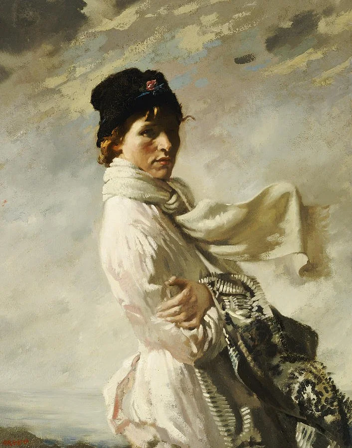 William Orpen painted The Artist’s Wife during his summers at Howth Head, a dramatic headland near Dublin where he found inspiration in the light, landscape, and sea air. The painting captures his wife, Grace, poised against the wind-swept cliffs—a moment of stillness within nature’s movement. Created in 1909, during a time of cultural revival in Ireland, the work blends Impressionist influence with classical portraiture, reflecting Orpen’s key role in shaping modern Irish art.