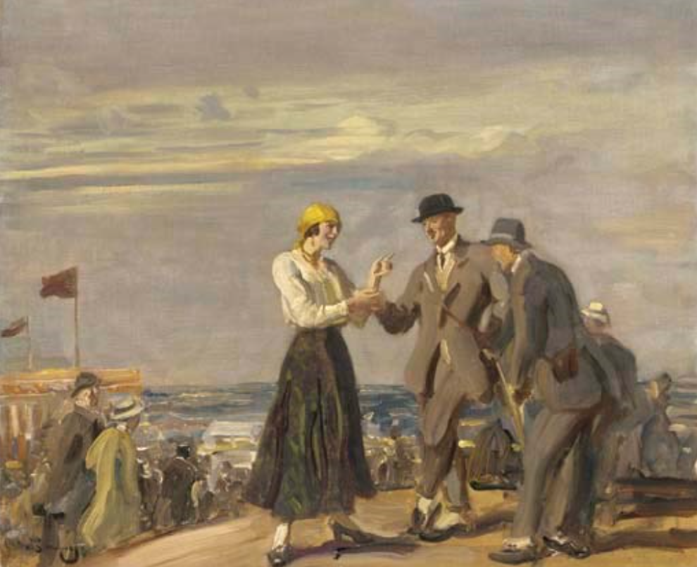 The setting of The Fortune Teller may be one of the country race meetings, such as St Buryan, which Munnings frequented while living at the artists' colony at Lamorna in Cornwall between 1911 and 1914. Although he had painted gypsies in East Anglia it was the gypsy hop-pickers he encountered on visits from Cornwall to Hampshire who really fired his imagination. 'Never in my life have I been so filled with a desire to work as I was then'. The women, who would often produce wonderful hats to be painted in, made particularly good subjects. 'Nobody could beat their style of dress, with black silk apron over a full-pleated skirt, a pink or mauve blouse showing off a tough, lithe figure; strings of red beads, and wonderful earrings glinting under blue-black hair.